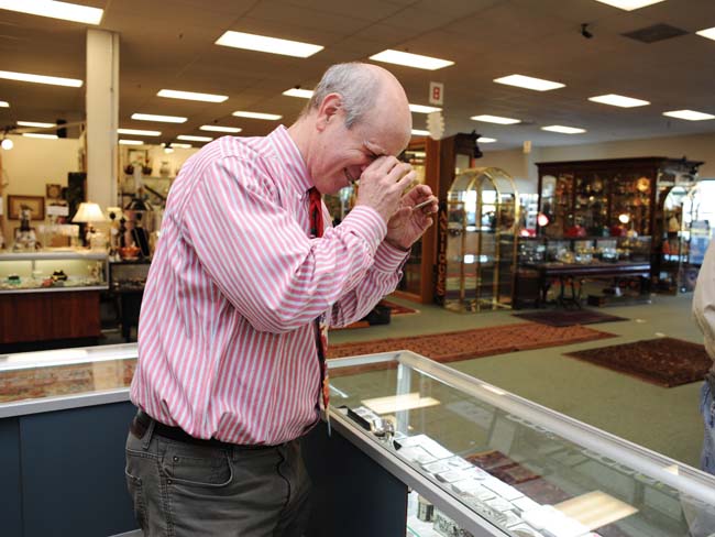 Gallery owner and numismatist, Norman Dill, inspects a rare coin.